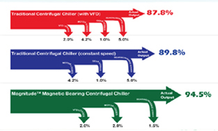水冷式離心機組是當前制冷業內可提供的高能效產品,但軸承摩擦和油損耗兩個因素依然會嚴重降低機組能效。為滿足不斷發展的節能市場需求,麥克維爾于上世紀九十年代開始研究磁懸浮技術,并于2003年推出磁懸浮變頻離心式冷水機組。