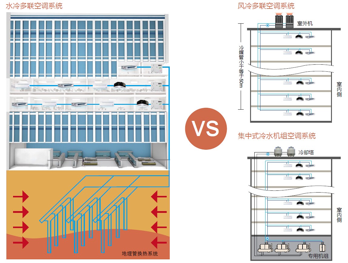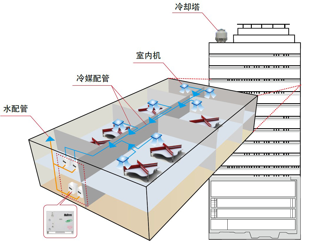 水冷多聯(lián)系統(tǒng)以水作為冷熱源,無需與外部空氣進(jìn)行換熱,機(jī)組內(nèi)置高效換熱器,主機(jī)結(jié)構(gòu)小巧緊湊,可將主機(jī)安裝在建筑物內(nèi)部,可輕松應(yīng)對玻璃外觀的需求。按照水源的循環(huán)方式不同,水冷多聯(lián)系統(tǒng)可以分為水環(huán)式水冷多聯(lián)系統(tǒng)和水/地源式水冷多聯(lián)系統(tǒng)。前者以冷卻塔、鍋爐組成的環(huán)路提供冷熱源,并且回收建筑內(nèi)余熱為主要特點(diǎn),后者則以地表水、地下水、土壤源、海水、城市污水等可再生能源作為冷熱源。