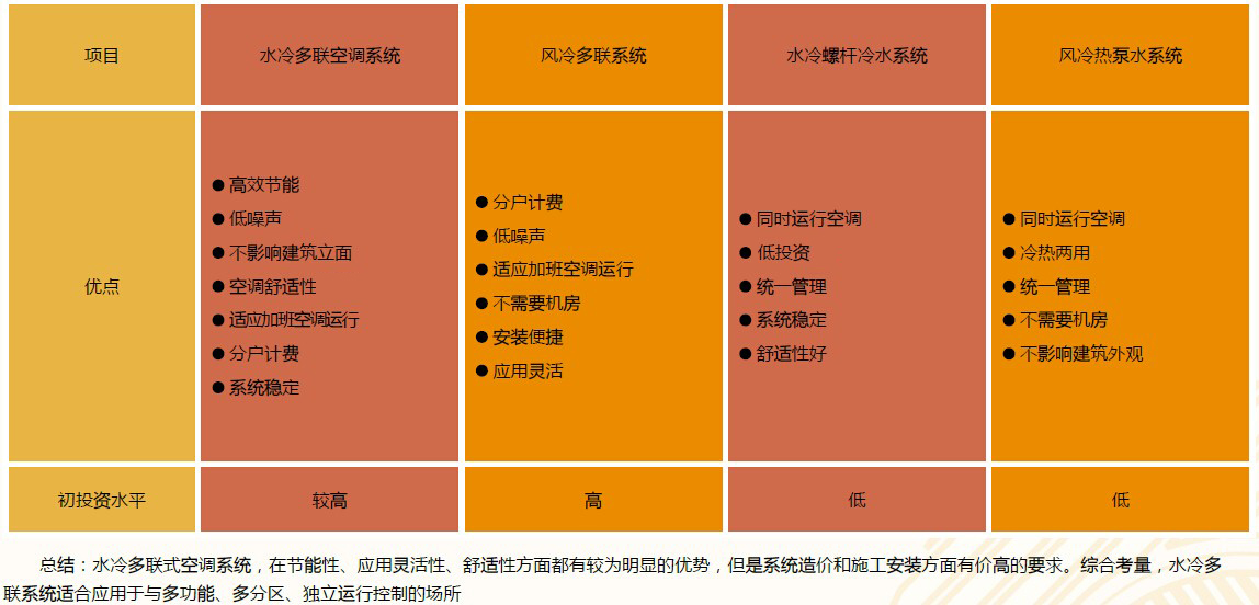 水冷多聯(lián)機(jī)是風(fēng)冷多聯(lián)機(jī)產(chǎn)品發(fā)展的新形式,不但延續(xù)風(fēng)冷多聯(lián)機(jī)技術(shù)和應(yīng)用優(yōu)勢,同時也繼承了冷水機(jī)組穩(wěn)定可靠等多方面的優(yōu)勢,是一款順應(yīng)時代發(fā)展的節(jié)能環(huán)保、應(yīng)用靈活的技術(shù)型產(chǎn)品。水冷多聯(lián)雖結(jié)合了風(fēng)冷多聯(lián)和水冷系統(tǒng)的諸多技術(shù),但在系統(tǒng)形式、系統(tǒng)特點(diǎn)和設(shè)計(jì)施工上有很多的區(qū)別,同時對比其他空調(diào)系統(tǒng)形式如:離心式/螺桿式冷水機(jī)組、風(fēng)冷熱泵機(jī)組等,也有自身的優(yōu)勢。