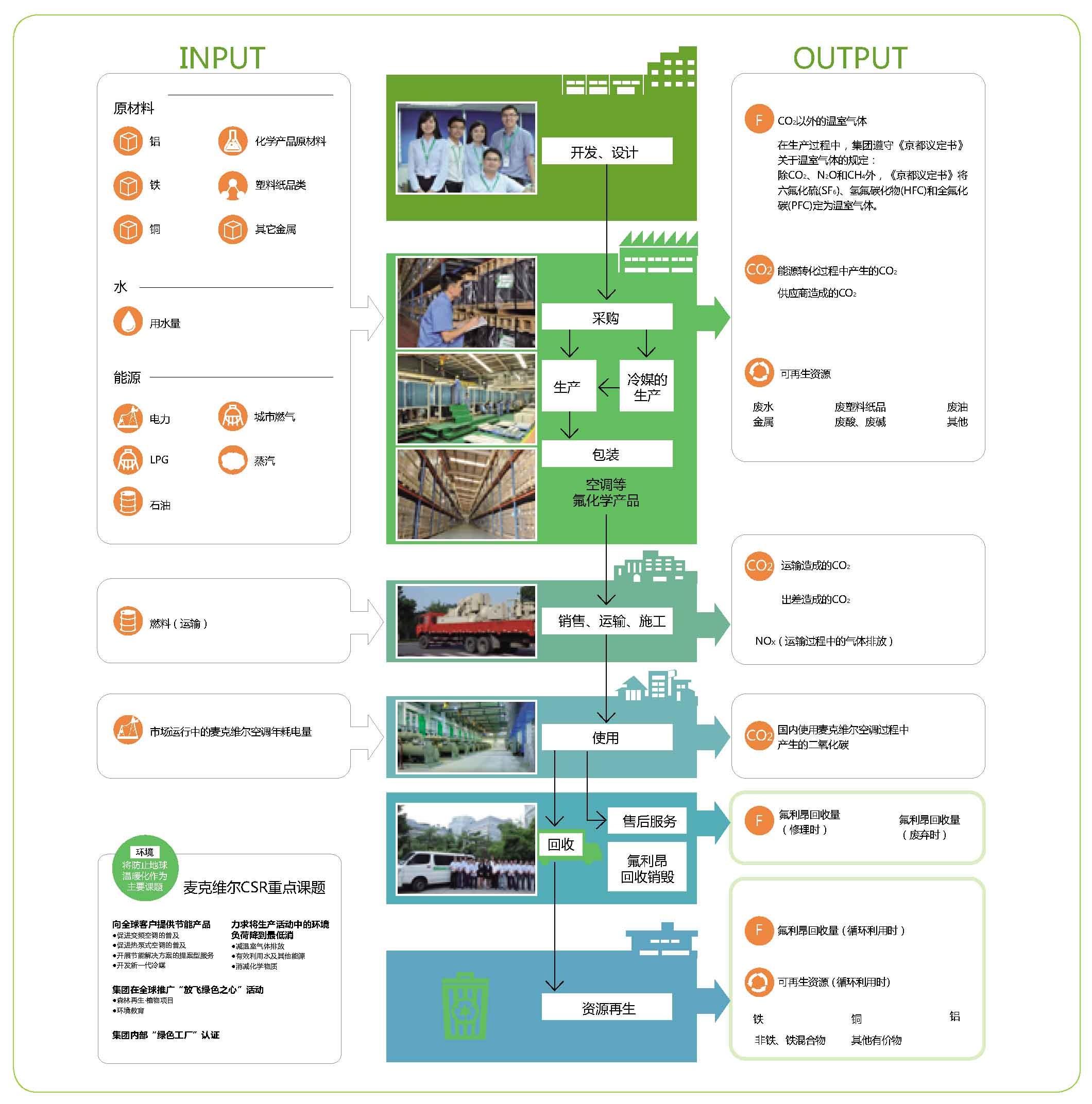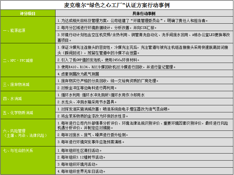 2005年麥克維爾正式啟動環境“綠色之心工廠” 評價認證制度;認證制度考察項目包括:能源起源、HFC.PFC減排、水消減、廢棄物消減、化學物質消減、風險管理(土壤、污染、法律風險)、與社會的關系。