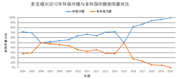 麥克維爾從進入中國至今,一直致力于踐行企業的環保理念。從圖表中可以看出,麥克維爾近10年來,非環保冷媒使用量正在逐年下降,環保冷媒使用量正在逐年增加。