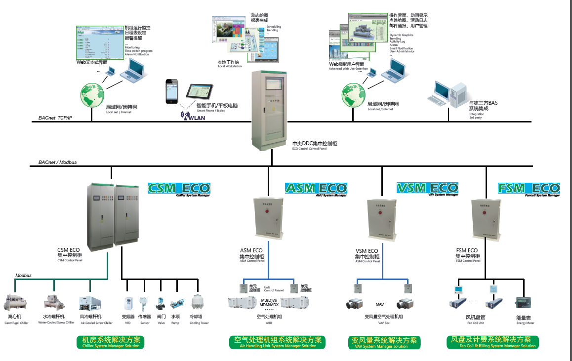 怡控TM系統解決方案是麥克維爾針對樓宇暖通系統中各個設備,向客戶提供完整的、有效的設備集中管理和監控,通過自動化的控制策略和操作實現系統性的節能。根據受控設備來分,怡控TM系統包含有CSM ECO(冷水機組系統管理),ASM ECO(風柜系統管理),FSM ECO(風機盤管系統管理),VSM ECO(變風量空調箱系統管理)等不同子方案。